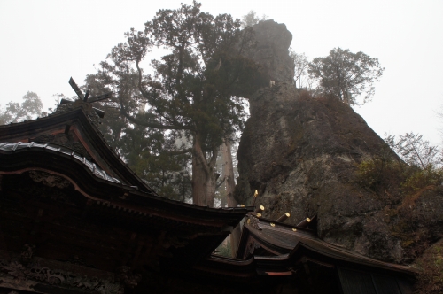 本殿の裏には落ちそうで落ちない岩があります。